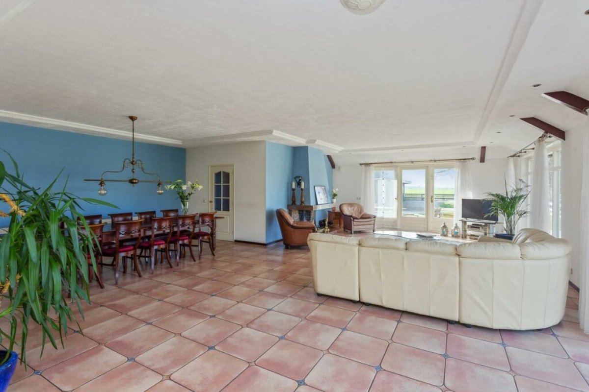 Begane grond: via de entree komt u in de ruime hal met een toilet. De hal biedt toegang tot een tweetal kamers, thans een herenkamer en een praktijkruimte, en de zeer royale woonkamer met open keuken. De lichte woonkamer met open haard heeft veel raampartijen die aan de achterzijde van de woonkamer een prachtig uitzicht bieden over de eigen weides en de polder. Via 2 openslaande deuren komt u uit op het grote terras op het zuiden. In de gezellige keuken vindt u diverse inbouwapparatuur zoals een 5-pits gasfornuis met brede oven, een vaatwasser en een Amerikaanse koelkast. Aan de achterkant van de woonkamer is een hal die toegang geeft tot de bijkeuken en de garage. Het terras is ook via deze bijkeuken te bereiken. In de woonkamer vindt u de trap naar de (wijn)kelder en toegang tot de wasruimte met een deur naar het terras aan de zijkant. Op bijna de gehele begane grond liggen Portugese tegels met vloerverwarming.
