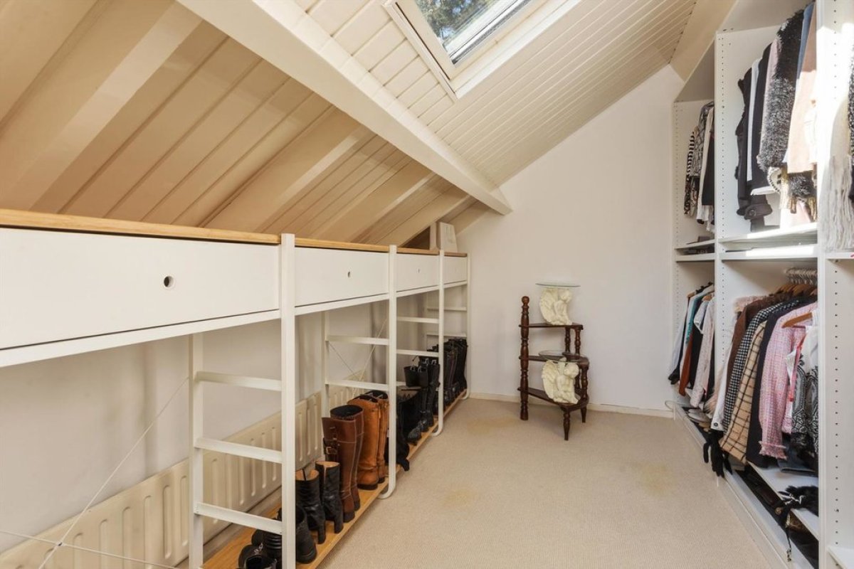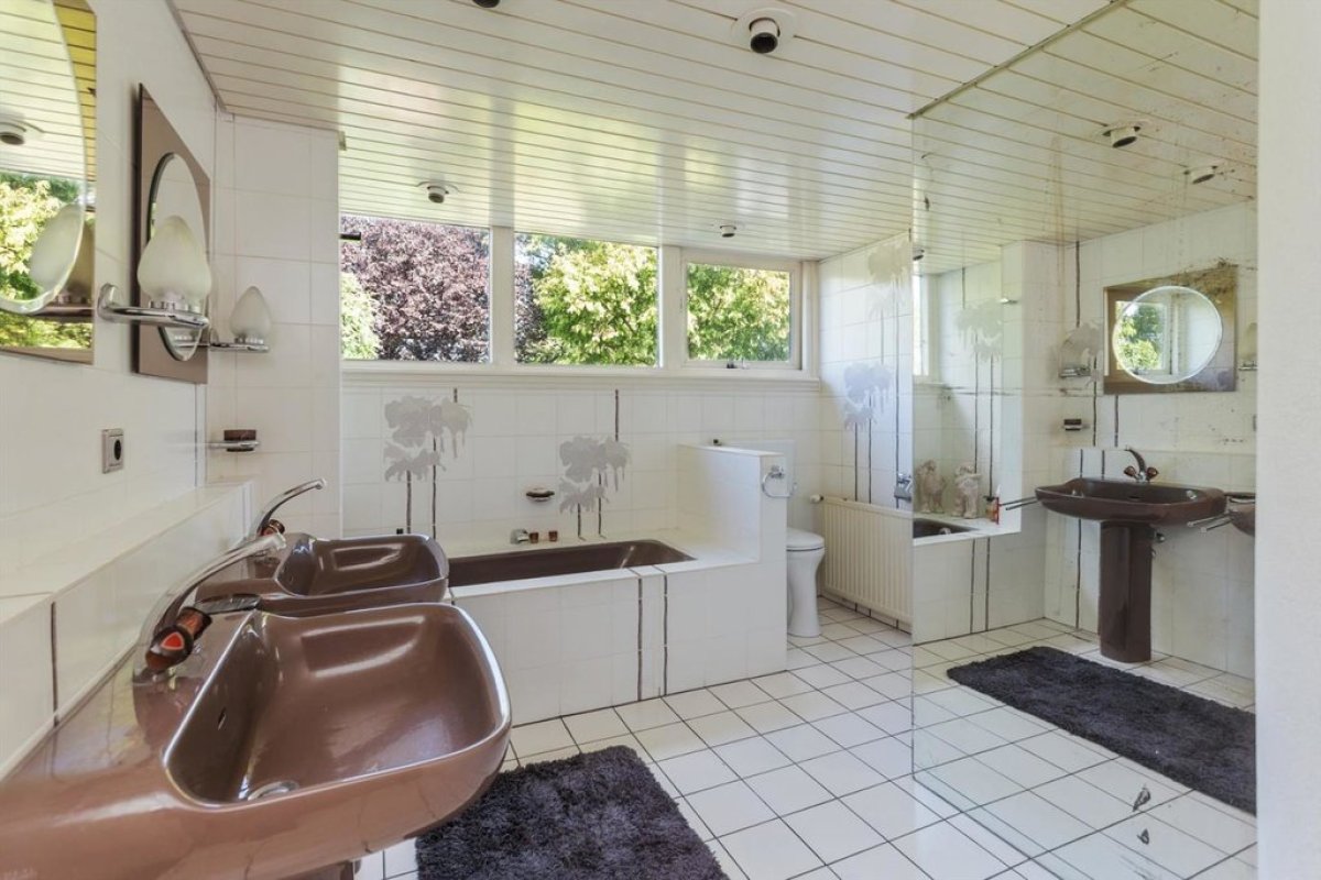 Eerste verdieping: via de trap in de centrale hal komt u op de overloop van de eerste verdieping. Hier vindt 4 ruime slaapkamers en de badkamer. De grootste slaapkamer met balkon ligt aan de achterzijde van de woning en heeft een kastenwand met toegang tot een extra bergruimte. De slaapkamer ernaast wordt nu gebruikt als walk-in closet. Ook de twee andere slaapkamers hebben een berging. De badkamer heeft een douche, een ligbad en 2 wastafels. Op deze verdieping vindt u verder nog 2 bergruimtes, waarvan een met een wastafel en in de andere is de cv-ketel geplaatst.