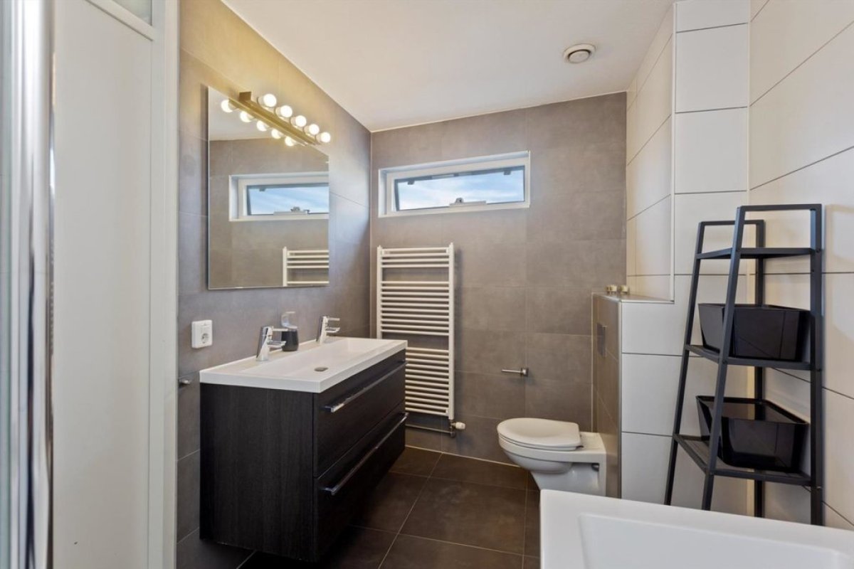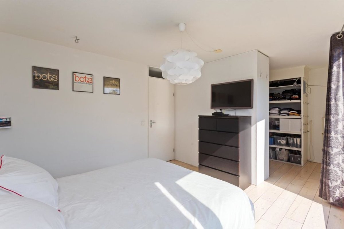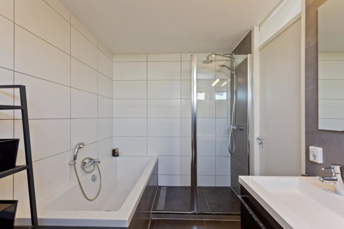 1e verdieping: via de trap komt u op de overloop. Hier treft u 2 kamers. De kleinste kamer is zeer geschikt als kinderkamer maar kan ook bijvoorbeeld als werkruimte ingericht worden. De tweede slaapkamer is royaal en heeft een grote inloopkast. Deze kamer heeft 2 openslaande deuren naar het zonnige dakterras van 20m2. Het is mogelijk om van deze kamer 2 slaapkamers te maken. Op deze verdieping is tevens de badkamer met een ligbad, een inloopdouche, een brede wastafel en het tweede toilet. Op deze verdieping ligt een houten vloer.