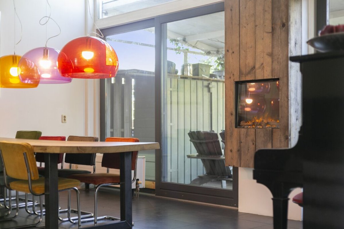 Begane grond: via de entree komt u in de ruime en lichte hal. Deze hal biedt toegang tot een toilet, een ruime berging en de royale living met halfopen keuken. U betreedt de living via het gezellige loungegedeelte dat overgaat in de lagergelegen woonkeuken. Onder de lounge-hoek zijn brede ladekasten aangebracht en er is tevens een ruime kast onder de trap. Bijzonder detail in de woonkeuken is de elektrische wandhaard met ledverlichting. Vanuit de living en de woonkeuken kijkt u uit op de zonnige, brede tuin aan het water. Via een schuifpui en een deur komt u op het overdekte terras. Aansluitend aan de woonkeuken vindt u de halfopen keuken met hoog plafond en een groot raam naar zowel de zonnige, brede achtertuin als de voordeur. De keuken is zeer compleet, voorzien van onder andere een oven, een vaatwasser, een vriezer en een koelkast en biedt enorm veel bergruimte. De woonkeuken is voorzien van vloertegels met vloerverwarming. De berging is ook van buiten toegankelijk via 2 openslaande deuren.