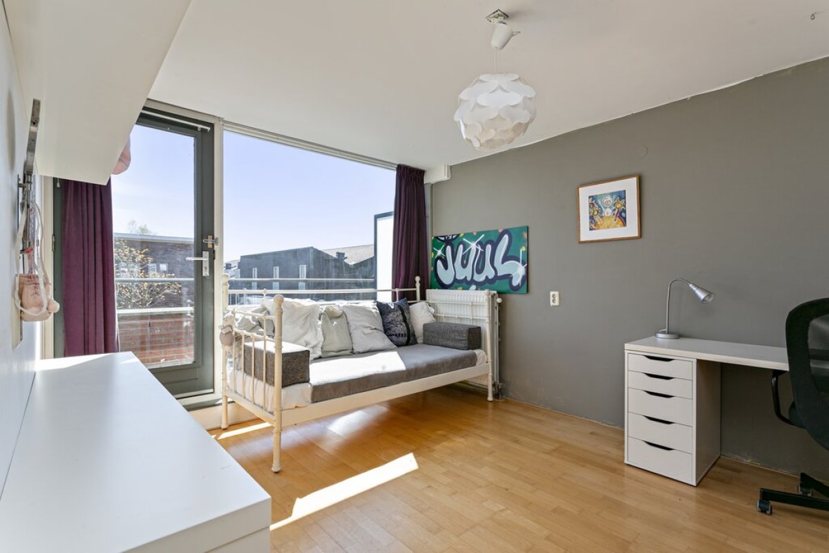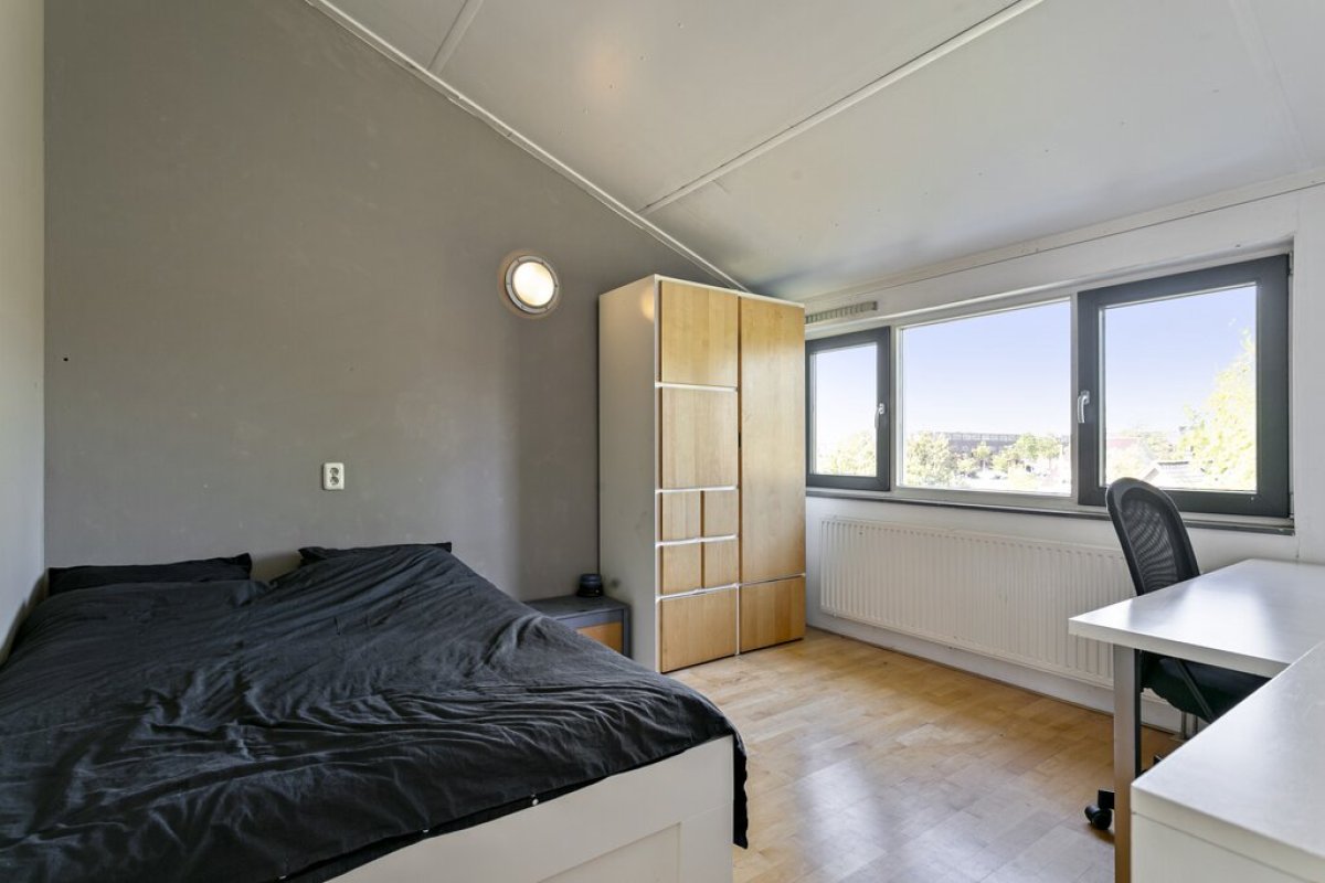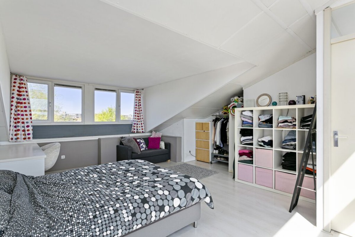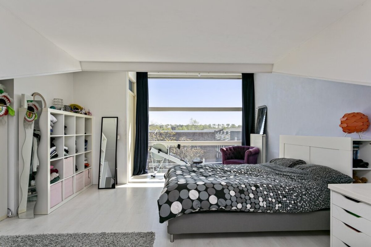 3de verdieping: Door het plaatsen van een dakkapel is hier een zeer ruime (slaap)kamer gecreëerd. De grote ramen zorgen voor veel lichtinval en een weids uitzicht op onder andere de molen van Sloten en de kerk in Oud-Sloten. De grote ramen aan de oostkant zijn aan de buitenkant voorzien van zonneschermen.