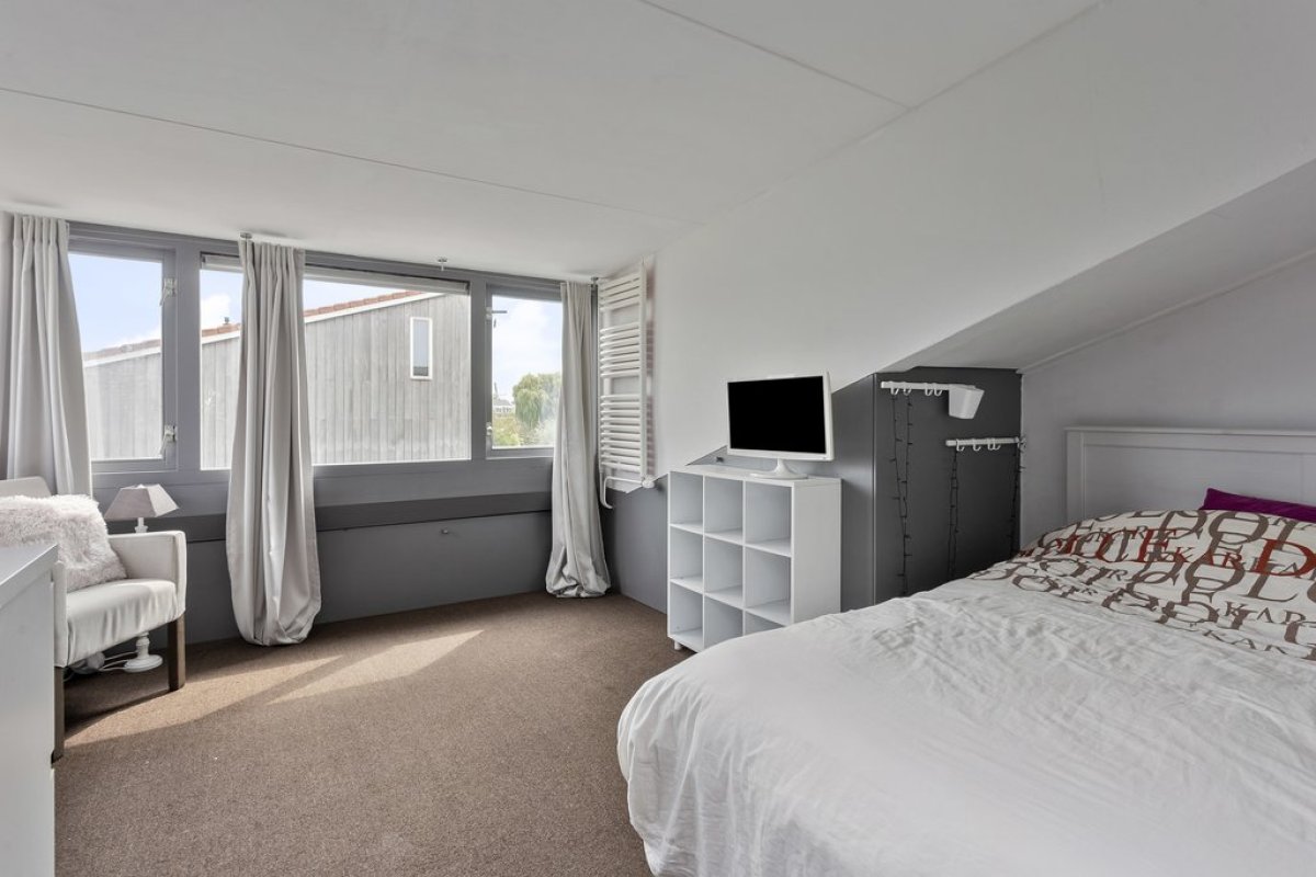 2de verdieping: via de trap komt u op de ruime overloop van de tweede verdieping. Hier treft u 2 grote, lichte slaapkamers. De slaapkamer aan de achterzijde heeft bovendien veel extra bergruimte. Tevens is er een ruime vliering in de gang.