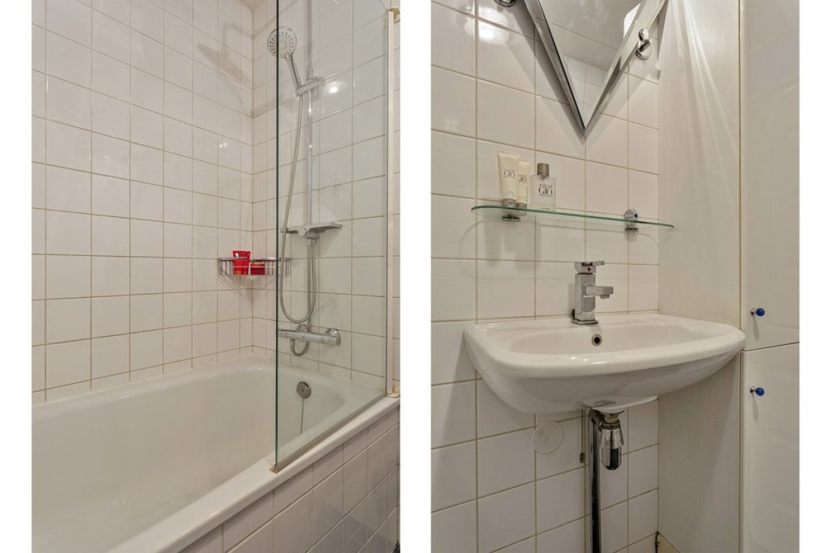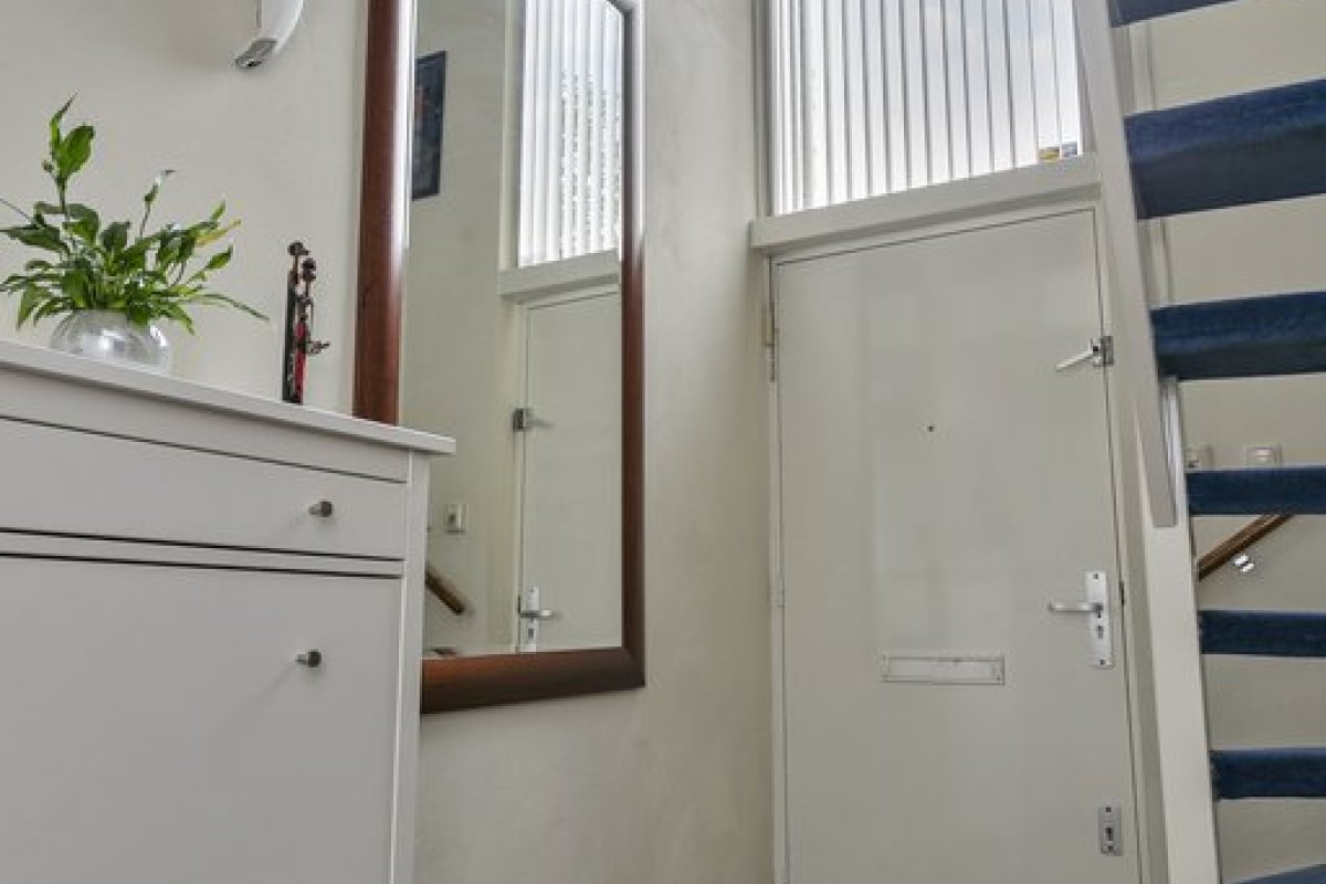 1e verdieping: via de open trap komt u op de overloop van de eerste verdieping die veel lichtinval heeft door het hoge glazen raam boven de voordeur. Op deze verdieping bevinden zich nu 3 slaapkamers. De oorspronkelijk ruime slaapkamer aan de achterzijde is door een wandje verdeeld in 2 kleinere slaapkamers. Aan de voorzijde bevindt zich nog een slaapkamer. De badkamer is voorzien van een douche-badcombinatie, een wastafel en aansluiting voor de wasmachine en droger. Op de overloop vindt u tevens een kast met de cv-installatie.