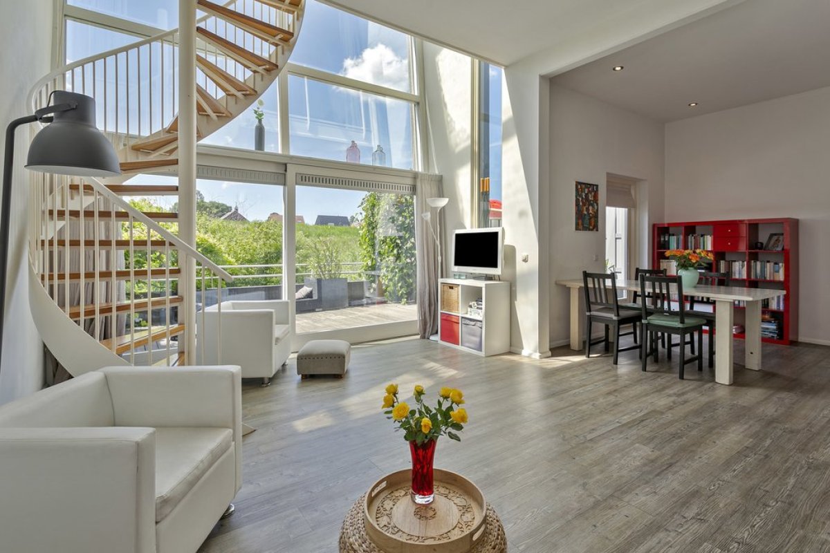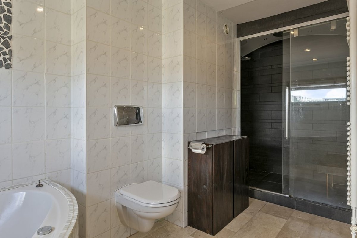1e verdieping: via de trap in de hal komt u op de eerste verdieping. De ruime woonkamer bevindt zich aan de achterzijde van de woning. De grote raampartijen en de vide zorgen voor een prachtig uitzicht op de dijk en de ecostrook en zorgen daarnaast voor veel lichtinval. Via de hal komt u tevens in de master bedroom met een badkamer ensuite. Deze badkamer heeft een ligbad, een toilet en een ruime douche. De woonkamer, de hal en de slaapkamer zijn voorzien van een tegelvloer met vloerverwarming.