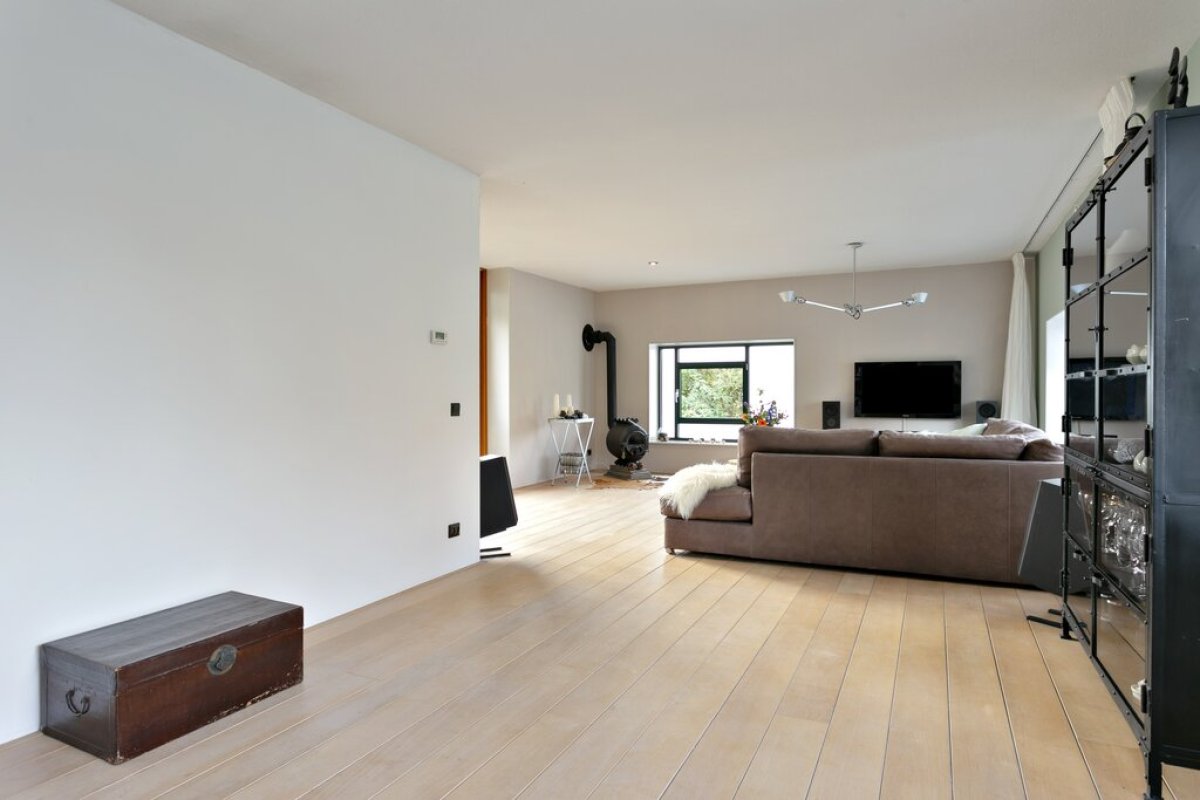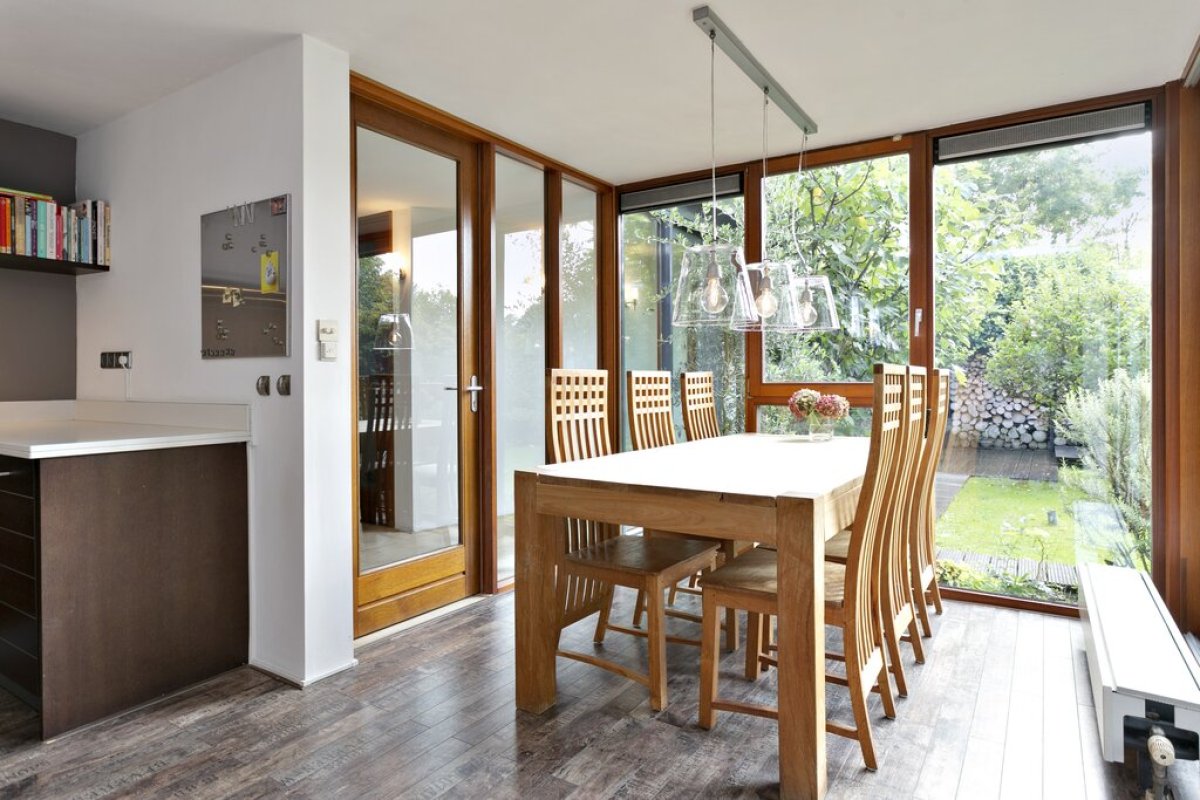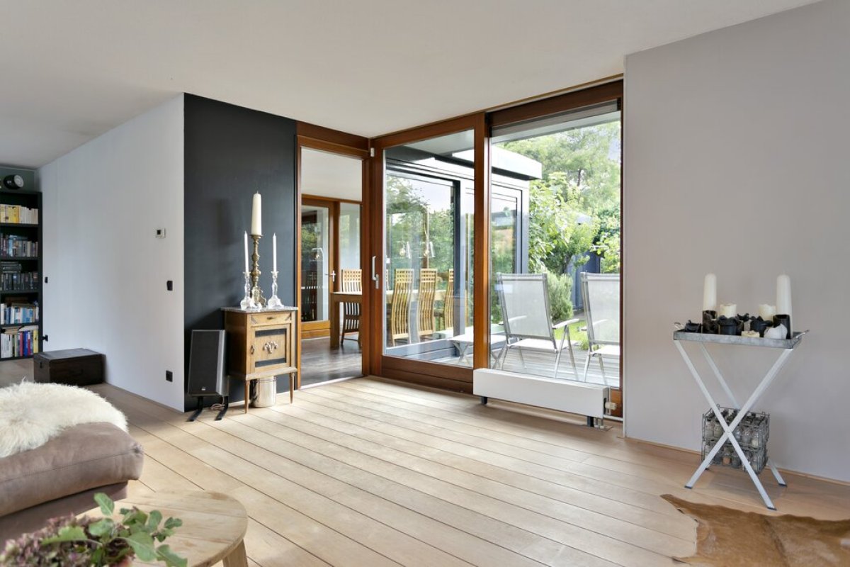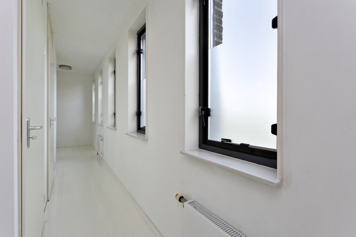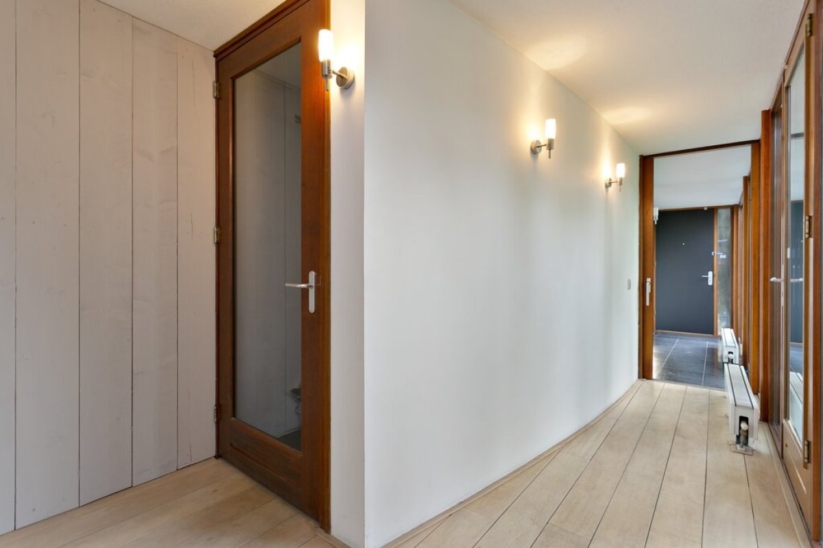 Begane grond: via de entree komt u in de imposante lichte hal met een toilet, de meterkast en garderobe. Vanuit de bijzondere hal van 9 meter lang kijkt u door de vele ramen (plafondhoogte) uit op de binnentuin. De hal biedt toegang tot de waskamer met veel bergruimte en biedt tevens toegang tot de woonkeuken. De moderne keuken met een schuifpui naar de binnentuin is voorzien van diverse inbouwapparatuur zoals een inductiekookplaat, een combimagnetron, een koelkast en een vaatwasser. Rondom vindt u kozijnen met glas tot aan het plafond en een prachtig zicht op de tuin. Via de woonkeuken komt u in de ruime woonkamer. In de kamer staat een sfeervolle houtkachel (merk Bullerjan) en is er een ruime inloopkast. Ook hier geeft een glazen schuifpui toegang tot de zonnige tuin. In de woonkamer ligt een massief houten vloer en in de keuken ligt laminaat met vloerverwarming.