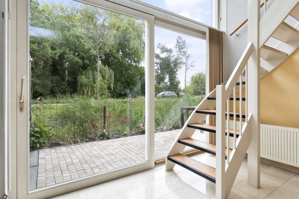 Begane grond: via de entree komt u in de ruime ontvangsthal. Hier vindt u een toilet en de meterkast. Vanuit de hal komt u in de garage, de badkamer, de woonkeuken en de tuinkamer. De badkamer heeft een wastafel, een douche en een ligbad. De grote, lichte tuinkamer aan de achterzijde wordt nu gebruikt als woonkamer maar kan ook als kantoor, praktijkruimte, woonkeuken, speelkamer of slaapkamer(s) ingericht worden. Deze kamer heeft een schuifpui naar de grote tuin. Ook zit hier een deur naar een (slaap)kamer en een deur naar een ruime berging. Aan de voorzijde vindt u de woonkeuken. Deze heeft veel lichtinval door de vide naar de eerste verdieping en de grote raampartij met uitzicht op de voortuin die grenst aan een sloot. De keuken is voorzien van diverse inbouwapparatuur zoals een 5-pits kookplaat, een elektrische oven, een magnetron, een vaatwasser en een vrijstaande Amerikaanse koelvriescombinatie. Er ligt een marmeren vloer met bijna overal vloerverwarming.
