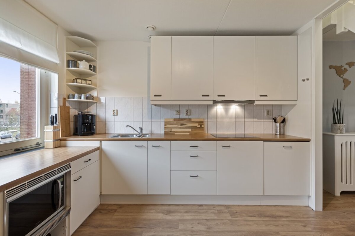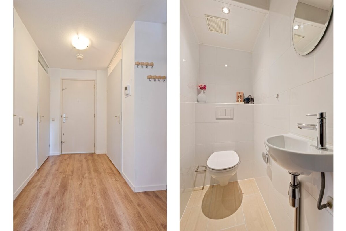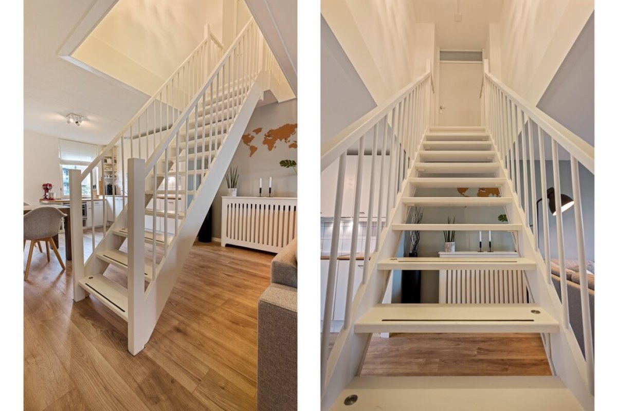Via de afgesloten centrale entree van het complex bereikt u met de lift de tweede verdieping waar de entree van de woning zich bevindt. De hal biedt toegang tot 2 grote slaapkamers (waarvan een met inbouwkast) en de moderne badkamer met een douche, een wastafelmeubel en aansluiting voor wasmachine en droger. In de hal vindt u tevens een separaat toilet en de trap naar de benedenverdieping waar de woonkamer met open keuken zich bevindt. Het eetgedeelte aan de westzijde van de woning is heerlijk licht door de grote ramen en biedt voldoende ruimte voor een royale eettafel. De keuken is voorzien van diverse inbouwapparatuur waaronder een afwasmachine, een combimagnetron en een keramische kookplaat. Het zitgedeelte van de woonkamer is ruim en biedt een weids uitzicht door de grote raampartij. Via een schuifdeur komt u op het overdekte terras op het oosten waar u heerlijk van de zon kunt genieten. Het appartement is bijna geheel voorzien van een laminaatvloer. In de onderbouw van het complex heeft u nog de beschikking over een bergruimte van 4 m2.