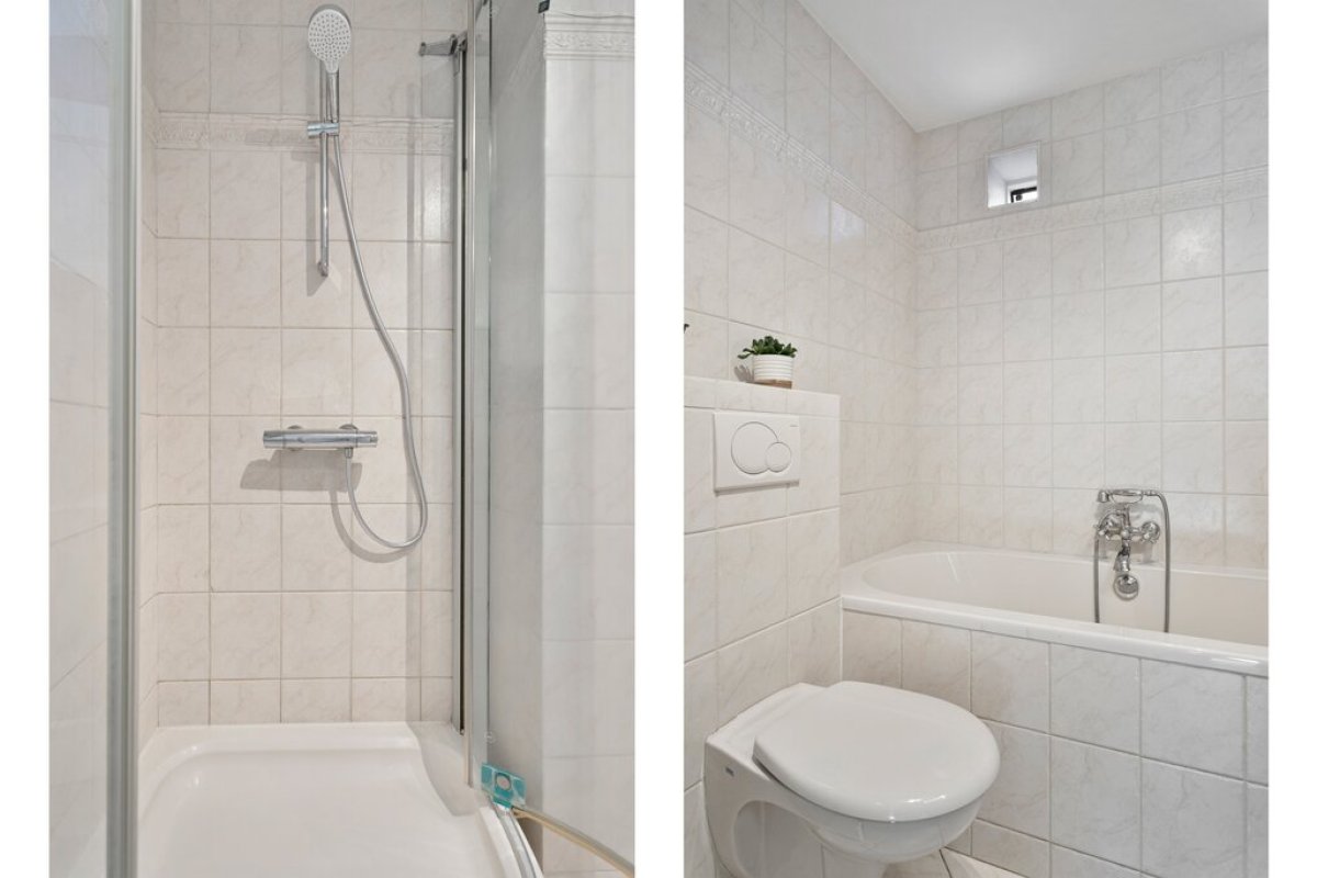 1e verdieping: via de gesloten trap in de hal komt u op de overloop van de eerste verdieping. Hier bevinden zich 2 zeer ruime slaapkamers. Het is mogelijk om hier een extra slaapkamer te maken. Ook vindt u op deze verdieping de badkamer met een douche, een ligbad, een toilet en een dubbele wastafel.