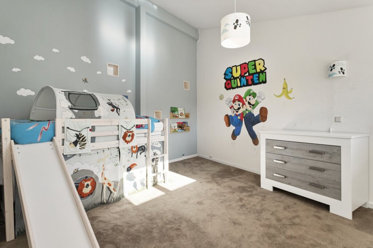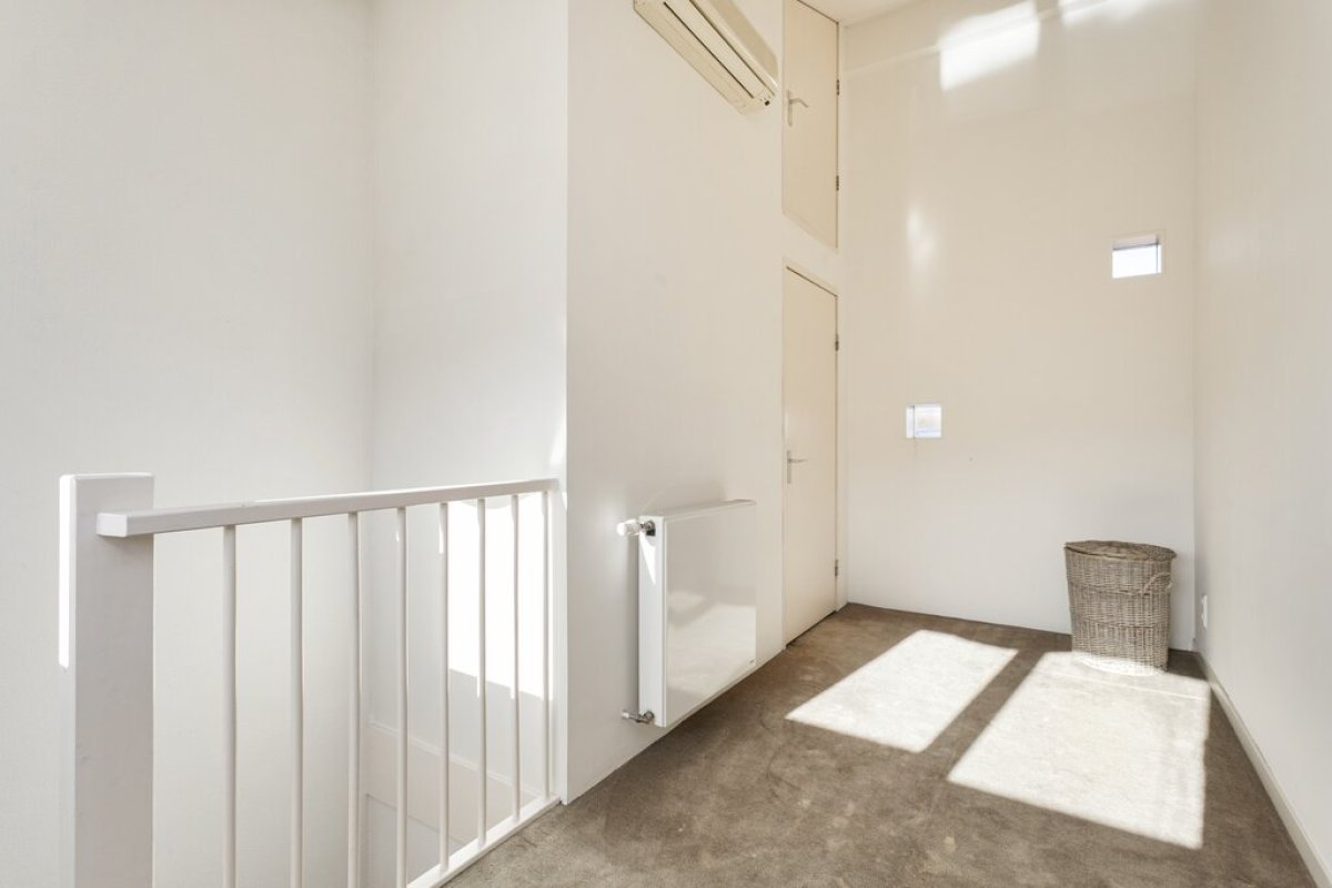 2de verdieping: via de trap komt u in de ruime hal die toegang biedt tot 1 grote slaapkamer met extra hoog plafond. Ook vindt u hier een berging met aansluitingen voor wasmachine en wasdroger, de mechanische installatie en de cv-ketel. Er is hier veel extra bergruimte gecreëerd onder het schuine dak en een berging boven het washok. Het is mogelijk om op deze verdieping een tweede badkamer te realiseren.