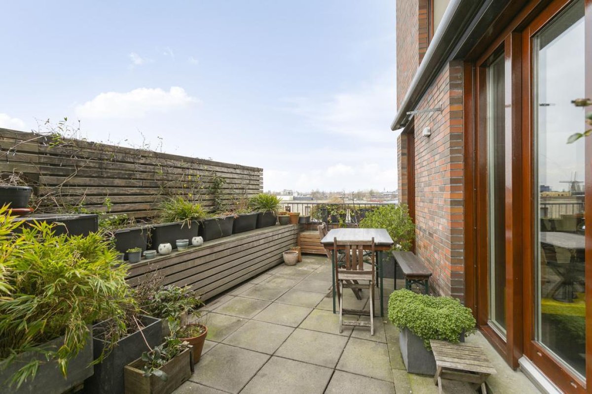 • Own ground • Modern and charming apartment of 122m2 (NEN 2580 report available) • Large private terrace of 22m2 with amazing view over Amsterdam • Private parking spot and storage of 6m2 in basement • 3 royal bedrooms • Energy label A • Storm proof screens for nearly all windows • Professional and healthy owners’ association with concierge • Monthly service costs €223, – for apartment and €33, – for parking spot • Conveniently located in Amsterdam Center • In car free Funenpark