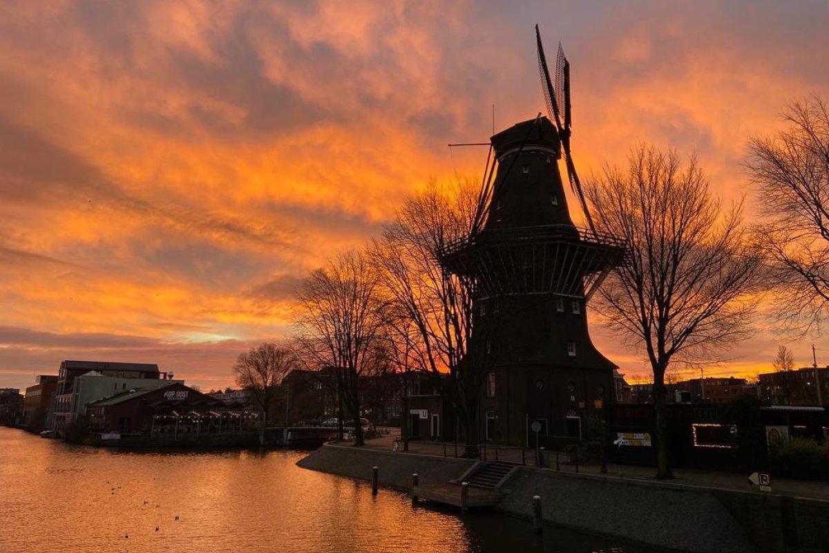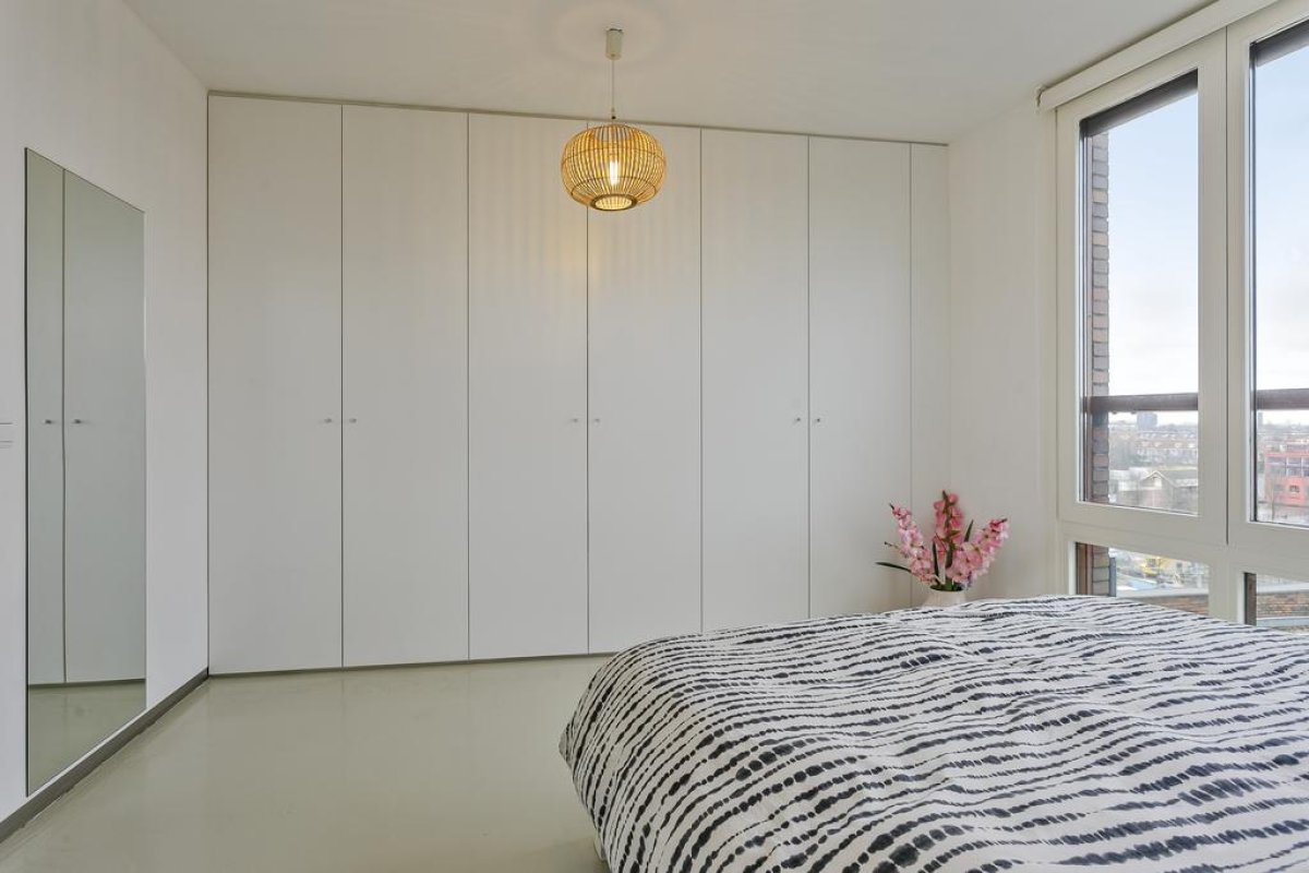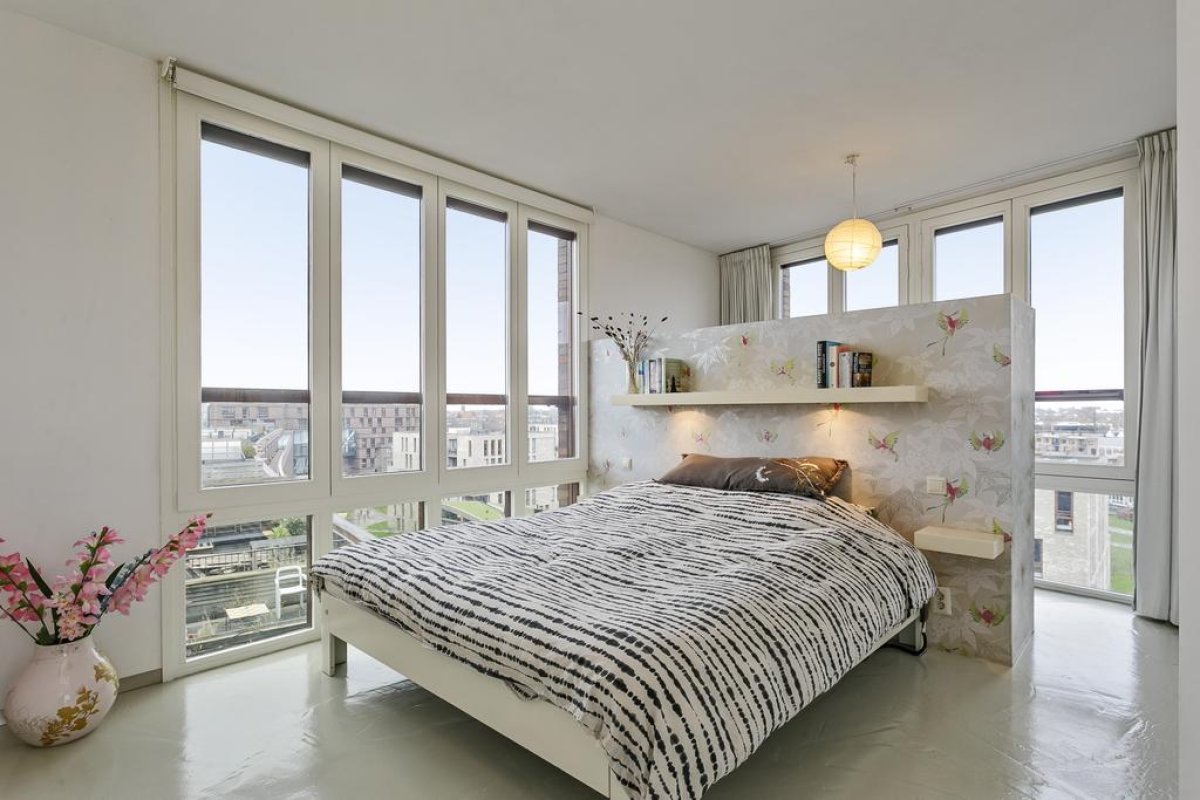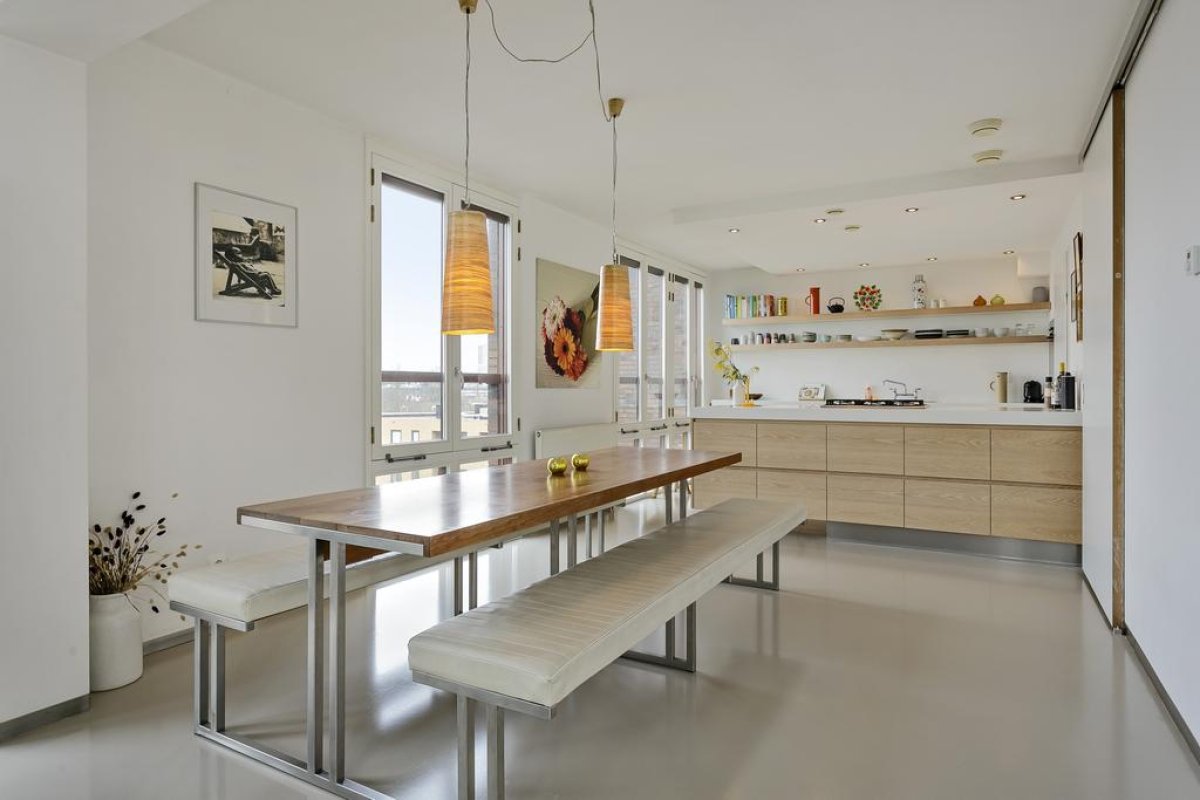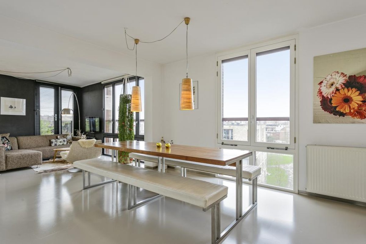 Woonkamer De sfeervolle living is ruim en zeer licht. U vindt hier een inbouwkast en een maatwerk bureaumeubel. Door de vele raampartijen kijkt u uit op het groene stadspark, molen de Gooyer en de stad. Alle ramen aan de westzijde hebben stormbestendige screens. De gehele verdieping is voorzien van een mooie, lichte gietvloer.