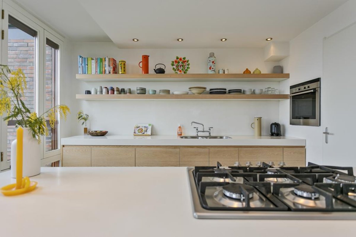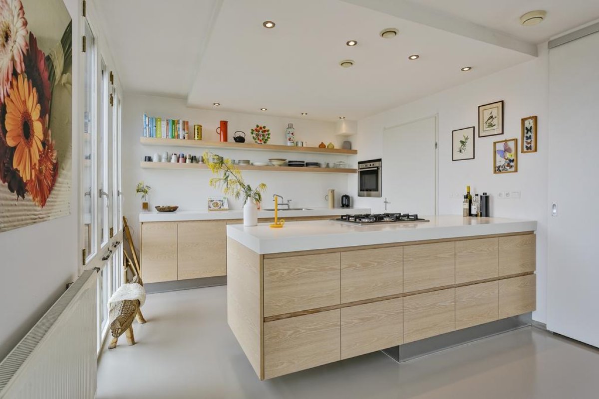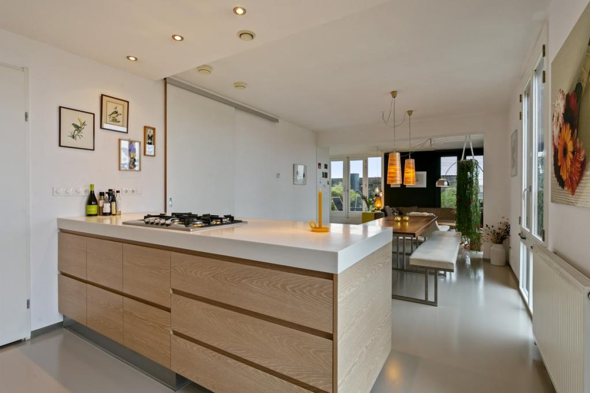 Open keuken De open keuken met kookeiland heeft twee werkbladen, vele laden en is voorzien van diverse inbouwapparatuur zoals een 5-pits gaskookplaat, een combi-oven, een koelkast, een vriezer, een vaatwasser en een dubbele spoelbak. Vanuit de keuken komt u in een bijkeuken met aansluiting voor wasmachine en droger. Hier vindt u nog meer bergruimte en de cv-ketel.