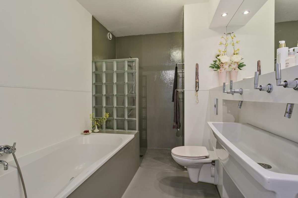 Badkamer De badkamer is voorzien van vloerverwarming en heeft een inloopdouche, een ligbad, een brede dubbele wastafel met spiegel over gehele lengte, inbouwspots en een toilet.