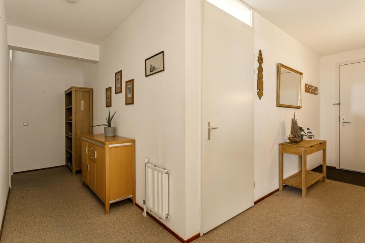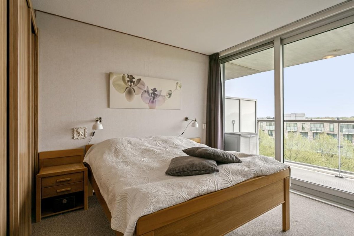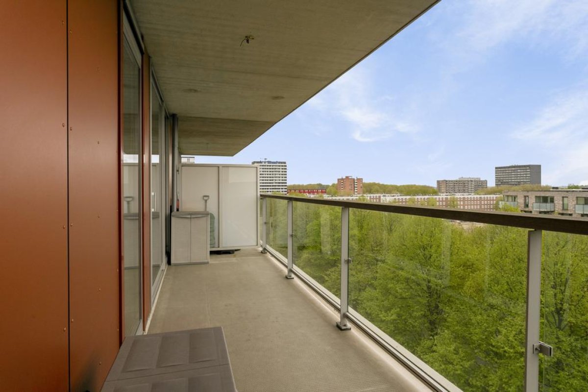Via de goed verzorgde centrale hal op de begane grond bereikt u via één van de twee liften de 6de verdieping. Door de voordeur komt u in de hal van het appartement. Deze biedt toegang tot het toilet met fonteintje, de berging met cv-ketel, de mechanische ventilatie en een aansluiting voor wasmachine en droger. Via de hal komt u verder in de woonkamer met halfopen keuken, de 2 slaapkamers en de moderne badkamer. De woonkamer is ruim en licht, heeft 2 Franse balkons en een deur naar het ruime overdekte balkon op het noordwesten. De hoge ramen bieden een wijds uitzicht over de groene omgeving. De open keuken is voorzien van een koelvriescombinatie en een 4-pits keramisch kookstel. De 2 slaapkamers van 12m2 en 11m2 zijn ruim en licht en hebben beide toegang tot het balkon. De ruime badkamer is voorzien van een inloopdouche, een wastafel en een opbergmeubel.