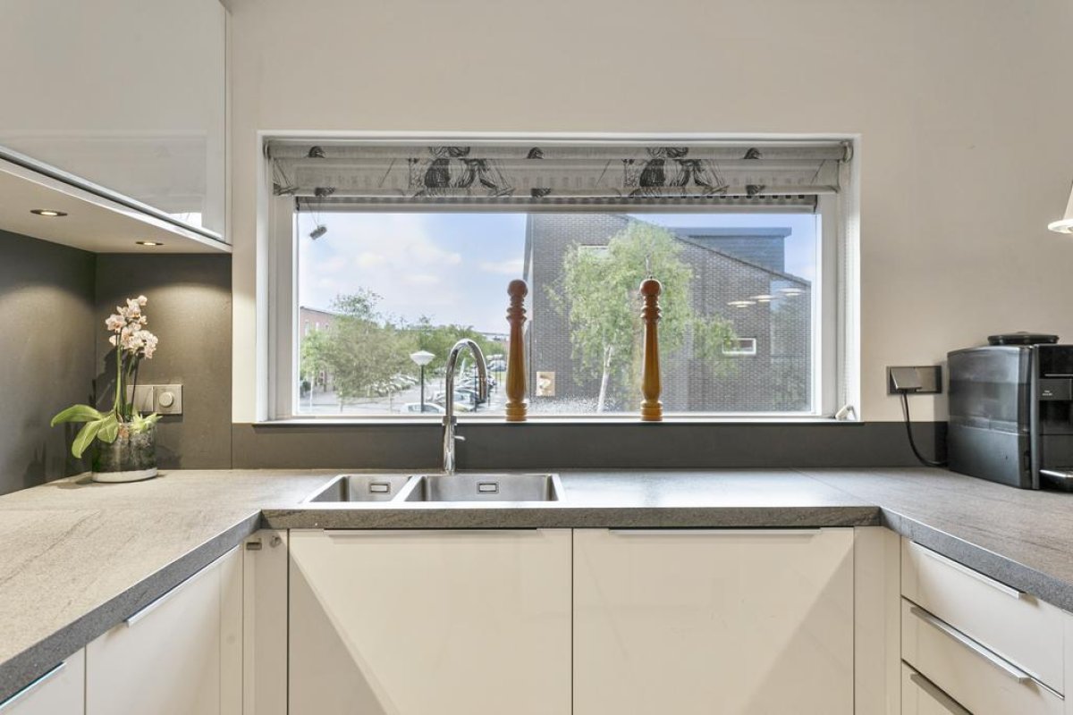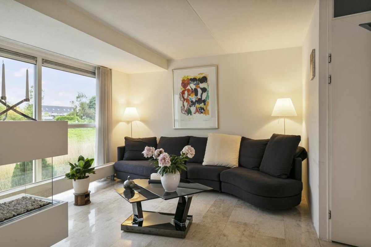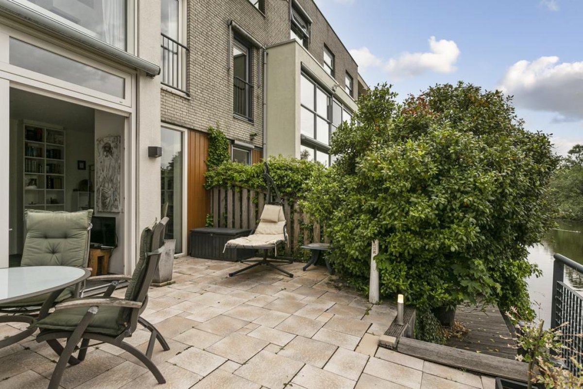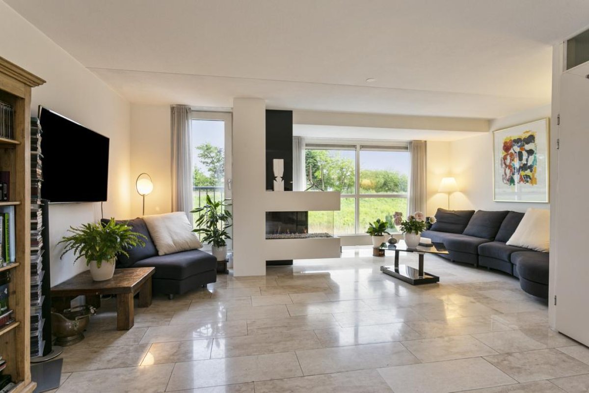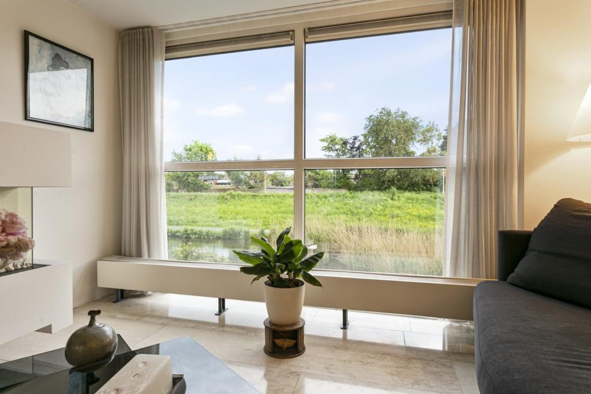 1e verdieping: via de trap in de hal komt u op de eerste verdieping waar de woonkamer en de halfopen keuken zich bevinden. De keuken heeft een schiereiland met bar en is voorzien van diverse apparatuur zoals een vaatwasser, een combi-magnetron, een Quooker, een inductiekookplaat en een Amerikaanse koelkast. Deze verdieping heeft aan de voor- en achterzijde grote raampartijen en Franse balkons waardoor er veel lichtinval is. Vanuit het zitgedeelte aan de achterzijde heeft u een prachtig uitzicht over de ecostrook en de Ringvaart. De moderne gashaard zorgt voor een warme sfeer. De gehele verdieping is voorzien van een marmeren vloer.