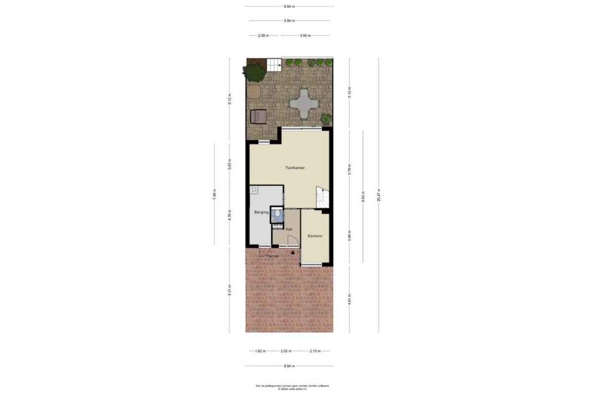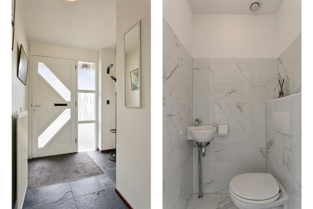 Begane grond: via de overdekte entree komt u in de ruime hal waar een toilet en de meterkast zich bevinden. De hal biedt toegang tot de tuinkamer die nu gebruikt wordt als kantoor. De tuinkamer heeft een schuifpui naar de zonnige, brede tuin die grenst aan de ecostrook. Het is zeer goed mogelijk om hier een royale woonkeuken te realiseren met directe toegang tot de tuin of een extra slaapkamer met badkamer. Ook kunt u de ruimte gebruiken als tuinkamer of praktijk-aan-huis. Via de tuinkamer komt u in het kantoor aan de voorzijde van de woning en de berging die ook van buitenaf bereikbaar is. Hier is nu de aansluiting voor de wasmachine. De vloer in de tuinkamer is van Noors leisteen en voorzien van vloerverwarming.