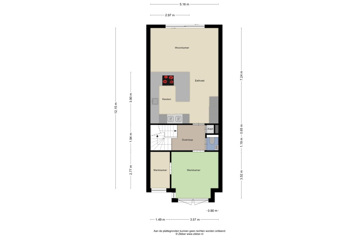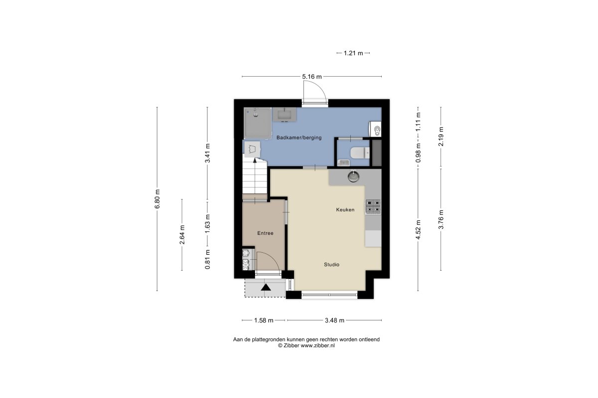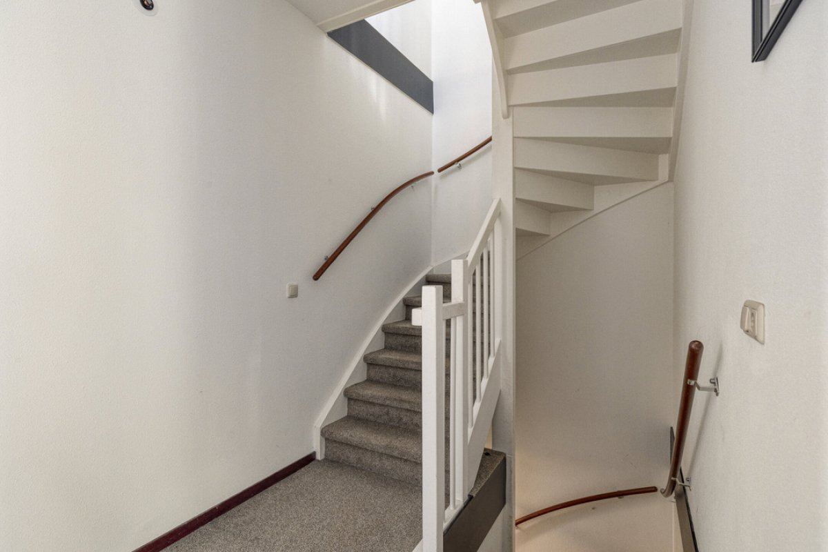 Begane grond: Via de entree komt u binnen in de hal met toegang tot de studio. Deze studio heeft een eigen keuken, badkamer met douche en wastafel, separaat toilet en aansluiting voor de wasmachine. Dankzij de eigen ingang is dit een volwaardige woonruimte die ook uitstekend gebruikt kan worden als kantoor, praktijkruimte of logeerplek. Vanuit de entree bereikt u ook de inpandige berging en de parkeerplaats in de afgesloten parkeergarage. Tevens is hier de trap naar de eerste verdieping.