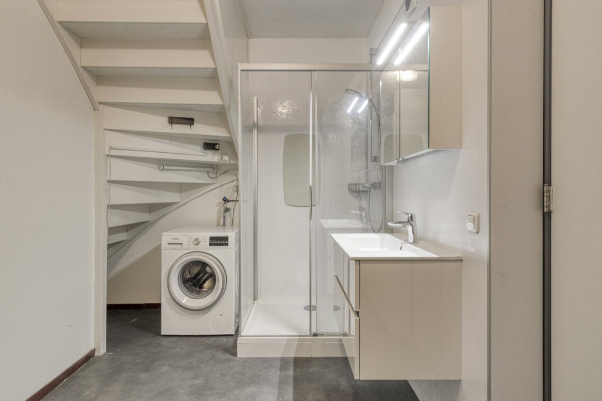 Ground floor: Through the entrance, you enter the hallway with access to the studio. This studio has its own kitchen, bathroom with shower and sink, separate toilet, and a connection for a washing machine. Thanks to its own entrance, this is a fully independent living space that can also serve perfectly as an office, practice space, or guest room. From the entrance you also reach the internal storage room and the private parking space in the secured parking garage. The stairs to the first floor are also located here.