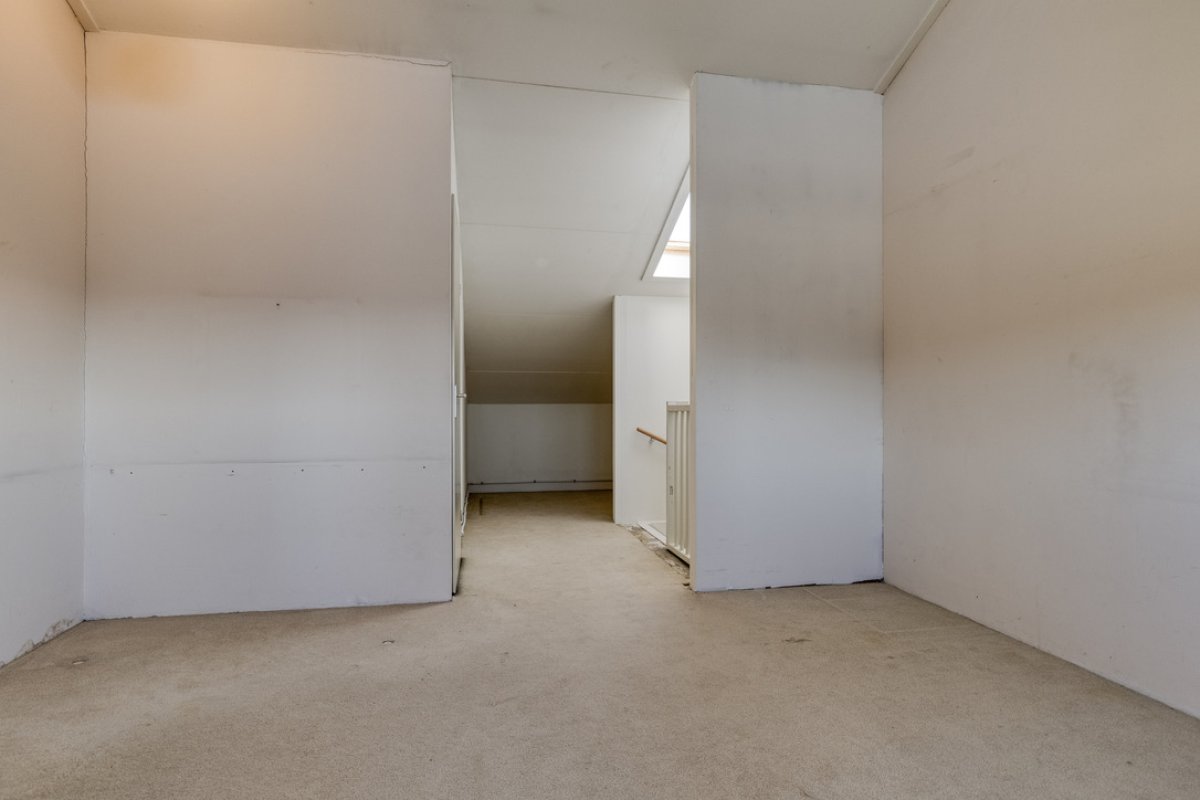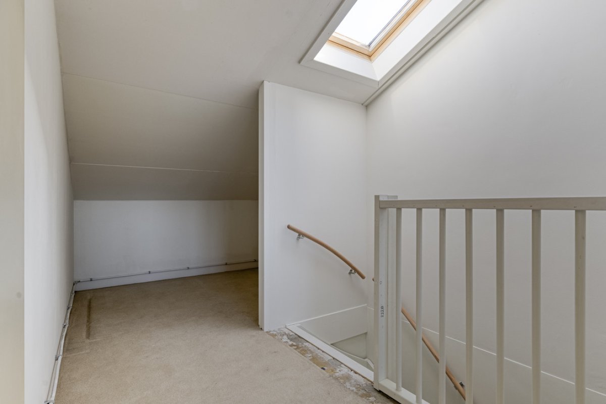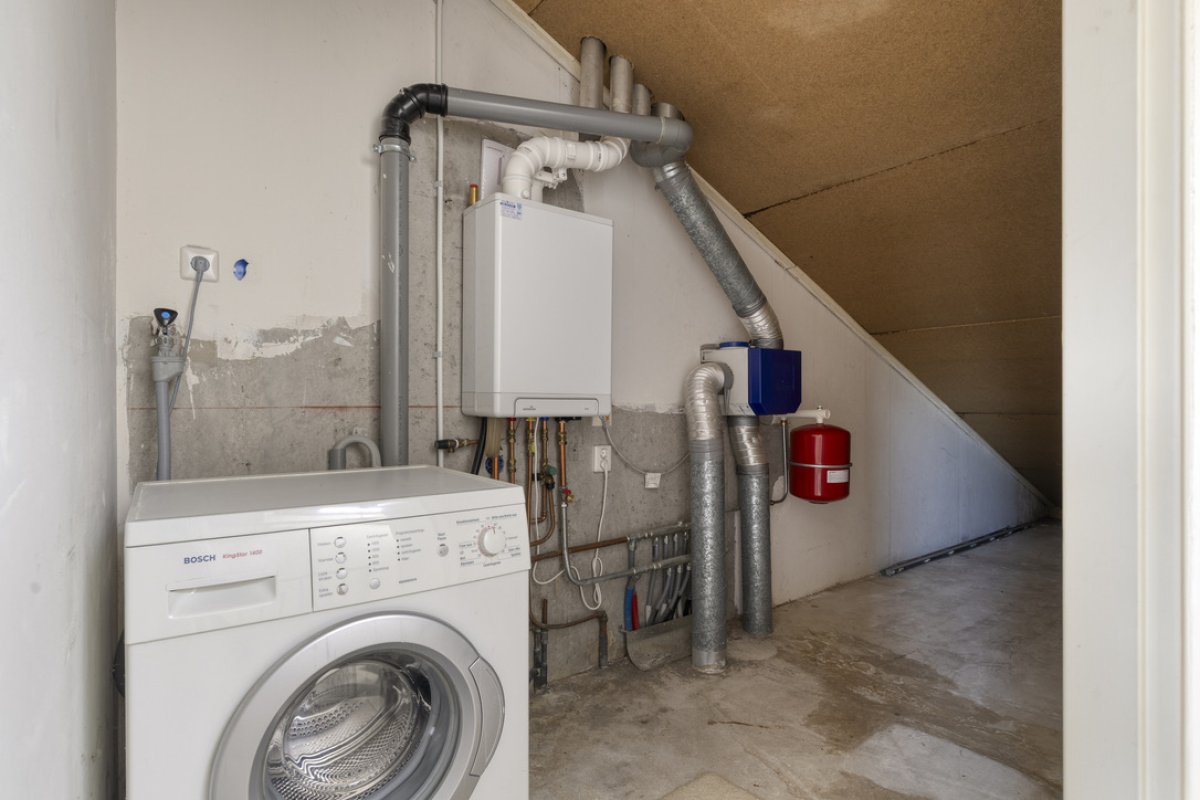 Third floor: A fixed staircase leads to the top floor, where you will find a large bedroom and workspace, as well as a separate room housing the central heating system. This space also includes connections for a washing machine and dryer and offers ample storage. The front room has an extra-high ceiling with space for a mezzanine, making it ideal for additional play or storage space. By adding a dormer at the rear, an extra bedroom and/or bathroom can be created.